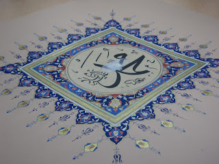 geceleri çalışmak sureti ile yorucu ama manen doyurucu bir çalışma oldu ,kişinin haleti ruhiyesi yaptığı her işe nükseder hatta çocuğuna eşine çevresine geçer.pozitif bir zaman dilimindeyim negaif düşüncelerden insanlardan uzak duruyorum.Hele ki tezhib yapıyorsam tamamen içe kapanırım sanat ,nakış ,tasarım,renk emek herhangi br sanat dalına benzemez tezhiblemek önemli olan yazınızı(Allah ,muhammed,ayetler v.s.)öne çıkarmaktır, bakanın kalbinde de hoşluk yaratan bu yazılara layıkı ile nacizane renklendirmek böylelikle zikrine ,fikrine işlemektir bakanların..Son halini yazımı uğurlarken yayınlicam inş :)